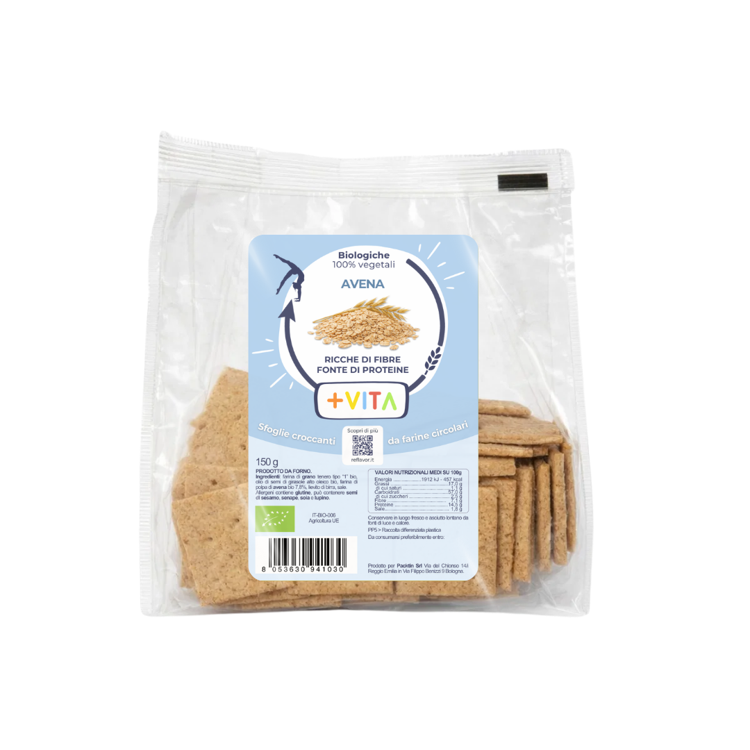 Crunchy Flatbreads are formulated with ReFlavor oat pulp, a product created through the upcycling and valorization of solid residues from plant-based milk production. Thanks to this ingredient, they are high in fiber and a source of protein.